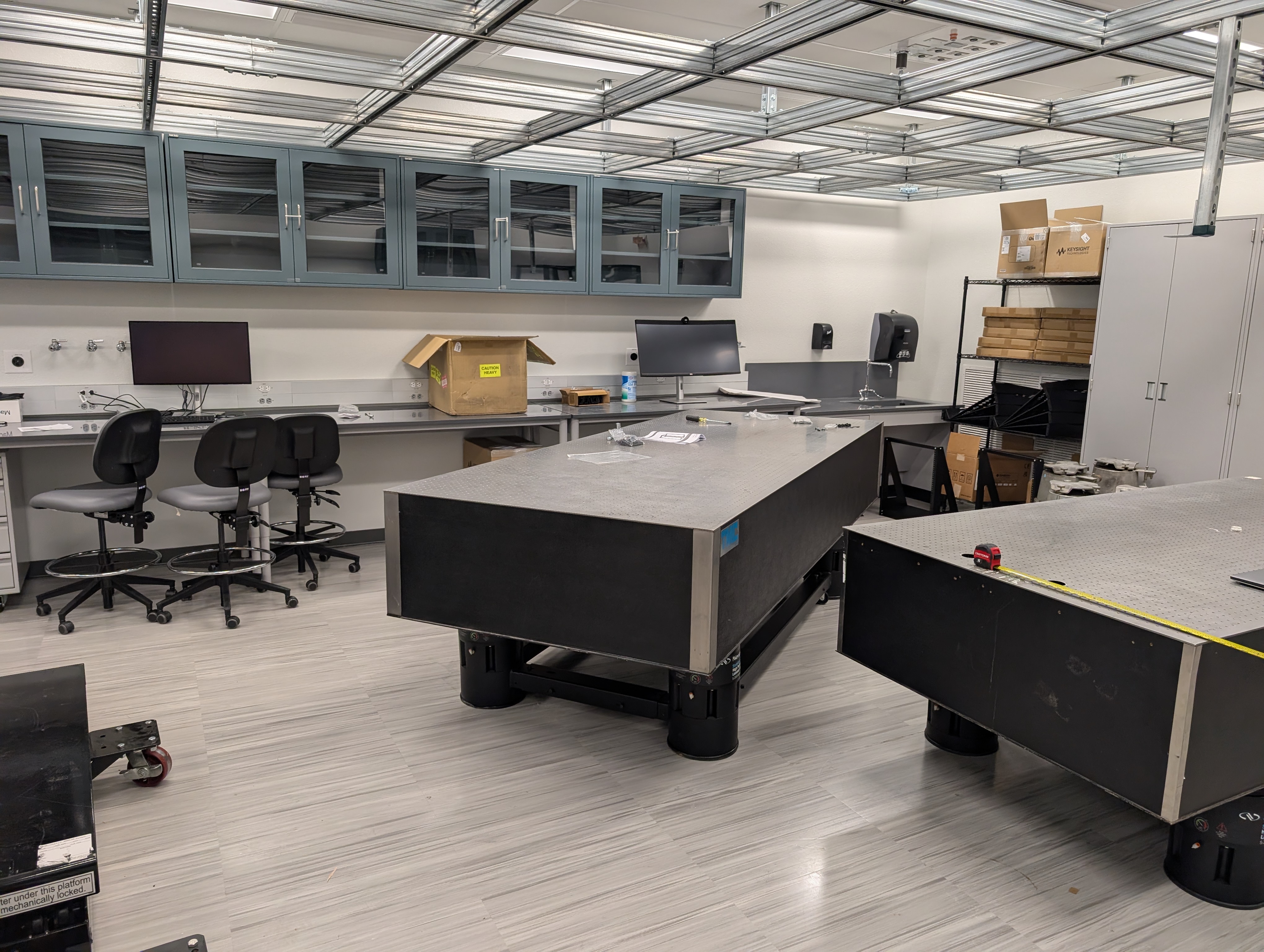 Our laboratory (B415) in the PAIS building basement features brand-new infrastructure for precision experiments with vibration isolation and temperature control.